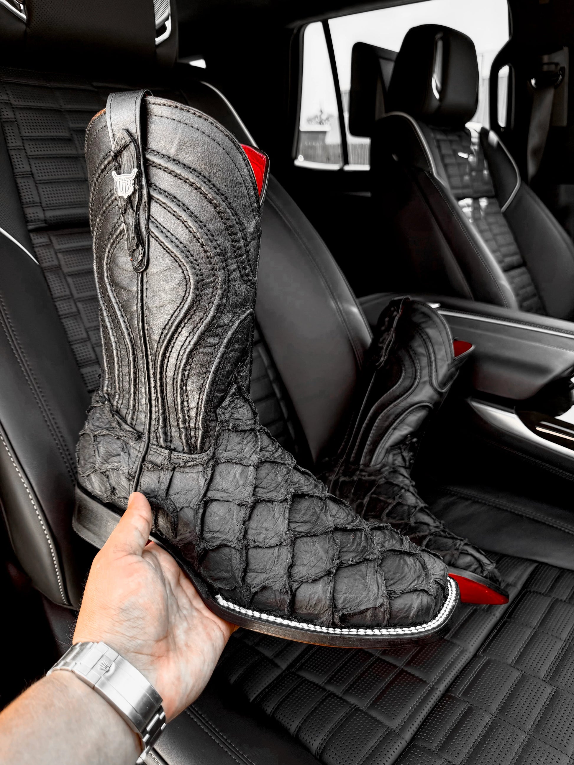 These boots combine the unique texture of pirarucu leather with timeless style, offering both sophistication and comfort.